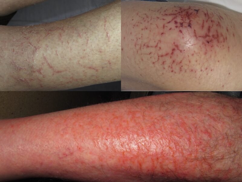 - Excoriations: This is when skin is broken from scratching too much, causing linear erosions.